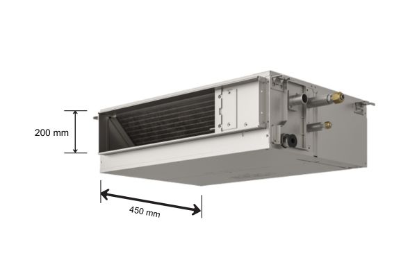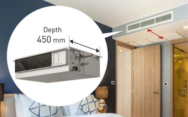 Với chiều sâu chỉ 450 mm và chiều cao 200 mm, dàn lạnh S-36MM2EA dễ dàng lắp đặt trong các khu vực trần giả có không gian hạn chế. So với phiên bản M1 trước đây, series M2 đã được rút gọn thêm 190 mm, giúp tối ưu diện tích lắp đặt, nâng cao tính thẩm mỹ và tăng sự linh hoạt trong thiết kế nội thất.